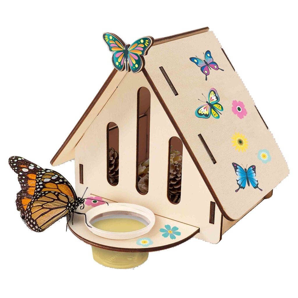 Het is tijd voor meer vlinders in de tuin of het balkon! Het Explore vlinderhotel kan door kinderen zelf gebouwd en versierd worden met vlinder stickers. Dit STEM-speelgoed is niet alleen leuk, maar ook erg leerzaam. Bouw stap voor stap het houten vlinderhotel en vul het daarna met natuurlijke materialen die je zelf buiten hebt gevonden. Zo maak je een beschut plekje voor de vlinders! Giet suikerwater in het bakje en wacht tot de mooiste vlinders afkomen op het zelfgebouwde vlinderhotel!