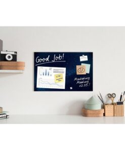 Het hoogglans glas-magneetbord uit de internationaal bekroonde Artverum-serie in het formaat 60 x 40 cm in het design Galaxy (motief: sterrenhemel) in blauw is eenvoudig te monteren in staand of liggend formaat met het meegeleverde bevestigingsmateriaal en met andere boards met dezelfde afstand tot de wand van 10 mm combineerbaar. Alleen magnetisch met sterke neodymium magneten, beschrijfbaar met krijt- en glasboardstiften, afneembaar met een vochtige of droge doek Frameloos voor een strak uiterlijk – alsof het voor de wand zweeft Gegarandeerde productveiligheid: TÜV- en GS-geteste veiligheidsophanging met gleuf voor het bijstellen van kleine boorfouten en voor een nagenoeg naadloze montage van meerdere magneetborden Hoogwaardig veiligheidsglas (ESG, EN 12150-1), met 4 mm glasdikte zeer robuust en krasbestendig. Extreem duurzaam met 25 jaar garantie op het glasoppervlak bij gebruik van SIGEL accessoires. Artverum is niet zomaar een glas-magneetboard maar een representatief designobject, waardoor u geïnspireerd zult raken.