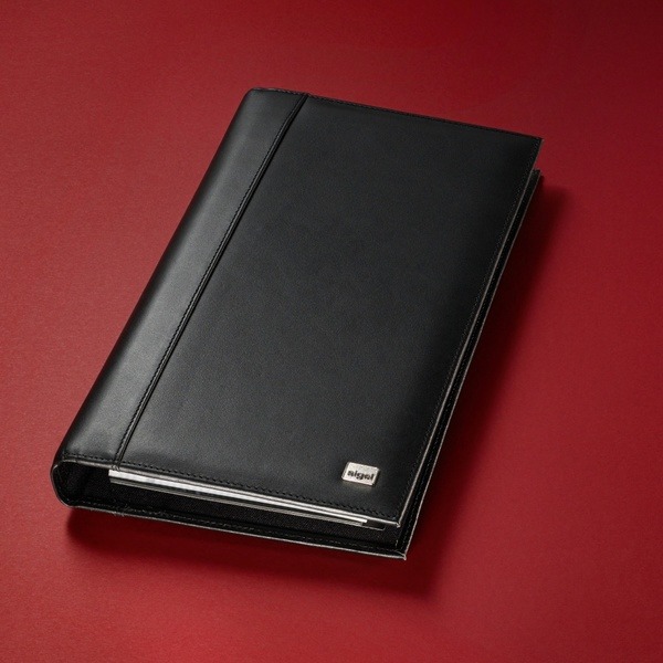 Visitekaartringband. Leer Torino. Zwart. Met 20 doorzichtige showtassen. Register A-Z. 4-rings mechaniek. Nappaleer. Voor max. 160 kaartjes (max. 90×58 mm).