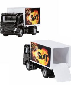 Staat er een verhuizing voor de deur? Of is de auto te klein voor het vervoer van zeer onhandzame voorwerpen? Geen probleem – alles past in de grote huurvrachtwagen met gesloten opbouw van Sixt! De zwart gelake metalen chauffeurscabine is gemonteerd op een twee-assig kunststof chassis met licht lopende wielen. Voor het laden en lossen van de vrachtwagen kan de achterklep van de gesloten opbouw worden geopend. Een echte blikvanger is de enorme drakenkop op de zijkanten die het Sixt logo met oranje-gele vlammen omarmt.