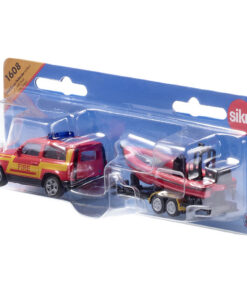 De Land Rover Defender in brandweeruitvoering is klaar voor veeleisende missies op elk terrein of het nu steile bergen, diepe kloven of ruige wegen zijn. Met zijn metalen carrosserie, robuuste kunststof chassis en sportieve rubberen banden trotseert de Defender elke route veilig, of het nu in de tuin, op de speelplaats of in een verzameling is. De lak en zilveren velgen geven hem een onmiskenbare uitstraling, terwijl het transparante zonnedak een blik in het interieur biedt. De koplampen en achterlichten zijn natuurgetrouw nagebouwd en het reservewiel aan de achterkant onderstreept zijn paraatheid. Dankzij de standaard geïntegreerde trekhaak trekt de Defender moeiteloos de meegeleverde plastic motorboot op zijn metalen trailer naar de volgende inzetlocatie. Of het nu op land of water is met deze indrukwekkende modelset staan spannende reddingsmissies niets in de weg!