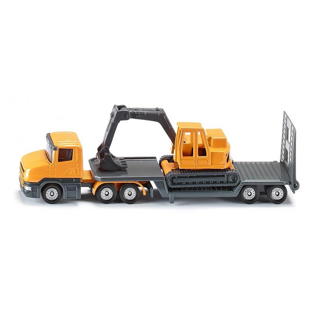 Siku 1611 dieplader met graafmachine.Breng de graafmachine van en naar het bouwterein met de dieplader.