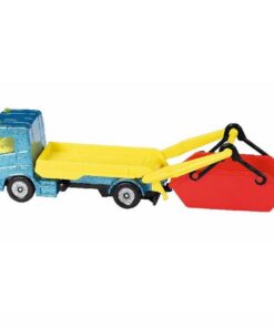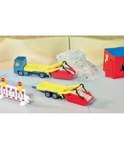 Zand, stenen of bouwpuin – de vrachtwagen met puincontainer en aanhanger neemt flink wat mee! Als trekker dient een twee-assige vrachtwagen met een metalen chauffeurscabine, de aanhanger is voorzien van een chassis met dubbele as en een metalen platform. Op zowel de vrachtwagen als de aanhanger kan een puincontainer worden vervoerd. De afzetinstallatie op beide voertuigdelen kan bewegen zodat de containers heel eenvoudig kunnen worden geplaatst en weer opgeladen. Licht lopende wielen op beide voertuigen zorgen voor wendbaarheid en eenvoudig manoeuvreren. De knalrode containers vormen een opvallend contrast met de blauwe vrachtwagen en de gele afzetinstallatie. Met deze bonte en veelzijdige set voertuigen kunnen steeds opnieuw scenes van de bouwplaats worden nagespeeld!