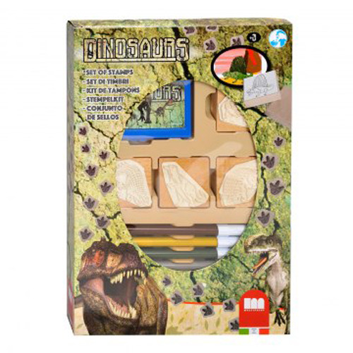 Deze 12-delige tekenset bevat naast 7 viltstiften ook nog 4 stempels en een stempelkussen in dinosaurusthema.De stempels kun je gebruiken om je tekening te versieren, of als basis voor een schilderij. Nadat je gestempeld hebt, kun je de afdruk inkleuren met de meegeleverde stiften.Op de stempels staan afbeeldingen van verschillende dino’s.