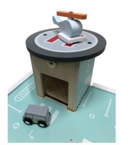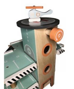 Mooie houten Studio Circus garage met meerdere verdiepingen. De garage heeft3 verdiepingen met hellingen, een autolift met een opwindmechanisme, een helikopterplatform, een benzinepomp en een wasstraat met twee wasrollen. Bij de garage horen 3 pastelkleurige voertuigen, een helikopter, een politieauto en een ambulance. Afmeting ca. 37 x 30 x 45 cm. Geschikt voor kinderen vanaf 24 maanden.