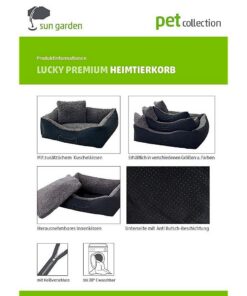 Het Duitse bedrijf Sun Garden, bekend van o.a. kwaliteitsmatrassen en boxsprings heeft nu ook luxe kleden en (orthopedische) kussens voor huisdieren ontwikkeld. Uw hond kan heerlijk ontspannen liggen in de comfortabele hondenmand Lucky. Het binnenkussen is omkeerbaar en heeft aan de ene zijde zacht pluche en aan de andere zijde robuust geweven katoenen stof. Met een extra wasbaar pluche kussentje.