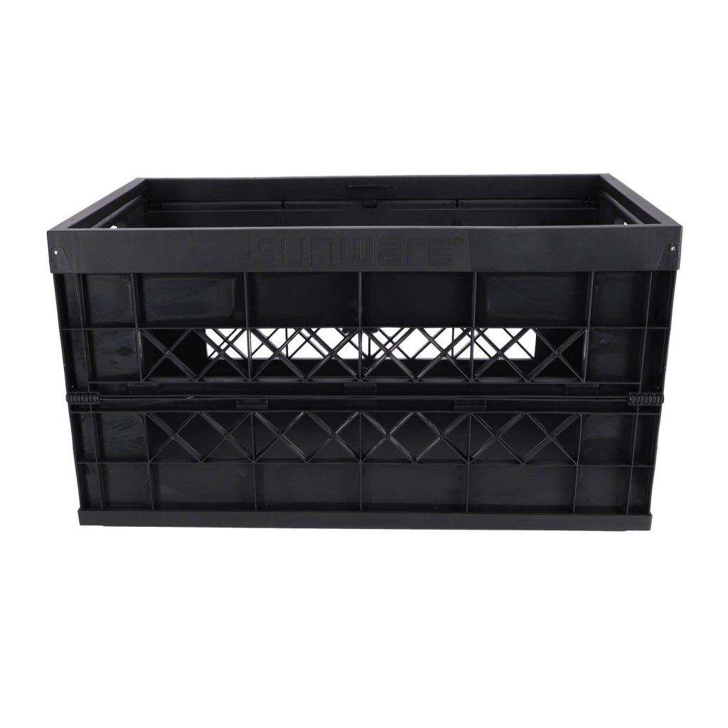 De zwarte Sunware Heavy Duty vouwkrat heeft een draagkracht van 45 liter en een extra versteviging dankzij zijn metalen pennen in de hoeken. Met open handvaten en is inklapbaar.