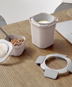 Zuivel, shakes, smoothies of zelfs soep meenemen wordt ineens een stuk makkelijk met deze superhandige, trendy lunchbeker! Deze hippe lunchbeker is onderdeel van onze Sigma home serie. Dat is te zien aan het moderne, Scandinavische design, de hoge kwaliteit en de trendy kleuren. De beker is uitgerust met de meest handige snufjes en features. Zo bestaat deze beker uit drie losse elementen. Een ergonomische buitenbeker (0,7L) en binnenbeker (0,5L) en een los bakje wat aan de onderkant vast te klikken is. Dankzij het dubbelwandige systeem blijft voedsel langer koel of juist langer warm als je het meeneemt. Daarnaast wordt hij aan de buitenkant niet heet of extreem koud vanwege deze extra isolatie. De stevige sluitclips zorgen dat het deksel nergens heen kan. Het deksel is transparant zodat je de inhoud kunt zien. Het losse bakje bevestigt aan de onderkant is met een simpele draaibeweging los te klikken. Daardoor hoeft u de beker nooit op zijn kop te houden om het bakje los te krijgen bijvoorbeeld wanneer de muesli in de beker gedaan moet worden. De kleine bakjes zijn als uitbreiding ook verkrijgbaar in een set van 3. De beker kan ook gebruikt worden om bijvoorbeeld soep in te verwarmen. Bij magnetron gebruik (tot 100°c) dient het deksel verwijderd te worden.