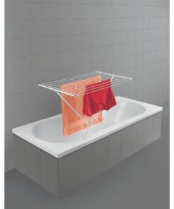 De wit gekleurde droogrek heeft openklapte afmetingen van 110 x 82 x 58 cm.