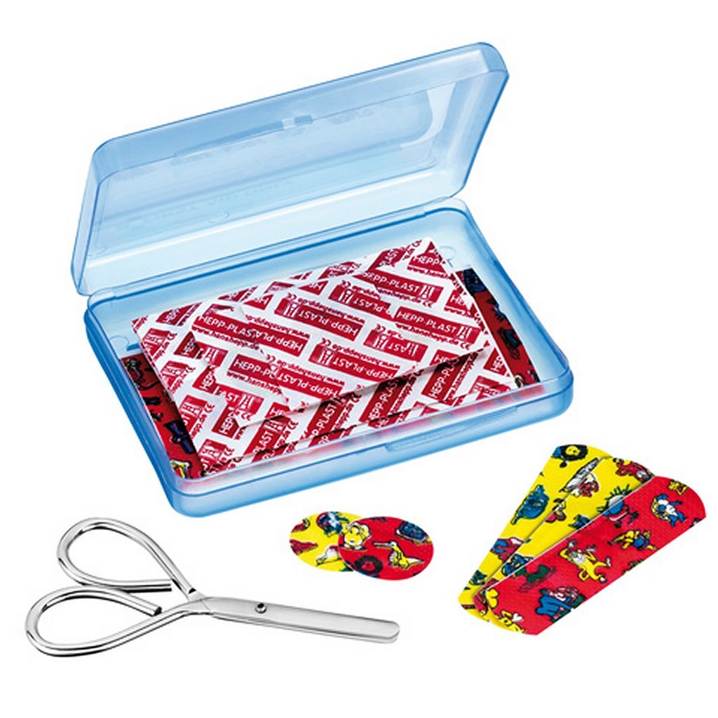 Bevat in totaal 20 pleisters in een hersluitbare plastic doos. 5 kinderpleisterstrips in de maten 6 x 10 cm, 1, 9 x 7, 2 cm, ca. 2, 5 cm en 1, 9 x 7, 2 cm gecoat met aluminium. Ook inbegrepen is een kleine roestvrijstalen EHBO-schaar. Ideaal voor eerste hulp bij kleine verwondingen bij kinderen, zowel thuis als onderweg.