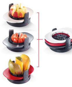 Met deze multisnijder kunt u appels, peren, tomaten, gekookte aardappelen, kiwi’s, eieren en zelfs mango’s snijden en het klokhuis verwijderen. De appelverdeler ontkernt en snijdt fruit gemakkelijk en snel in 8 uniforme stukken. De tomatensnijder maakt snel snijwerk dankzij de fijngetande messen en de mangoverdeler helpt je om mango’s gemakkelijk en snel doormidden te snijden. Dankzij de praktische snijplaat kunnen de inzetstukken veilig en ruimtebesparend worden opgeborgen. In tegenstelling tot conventionele fruitsnijmachines fixeert de praktische basis het snijmateriaal op zijn plaats, zodat het fruit in één handeling volledig kan worden gesneden.