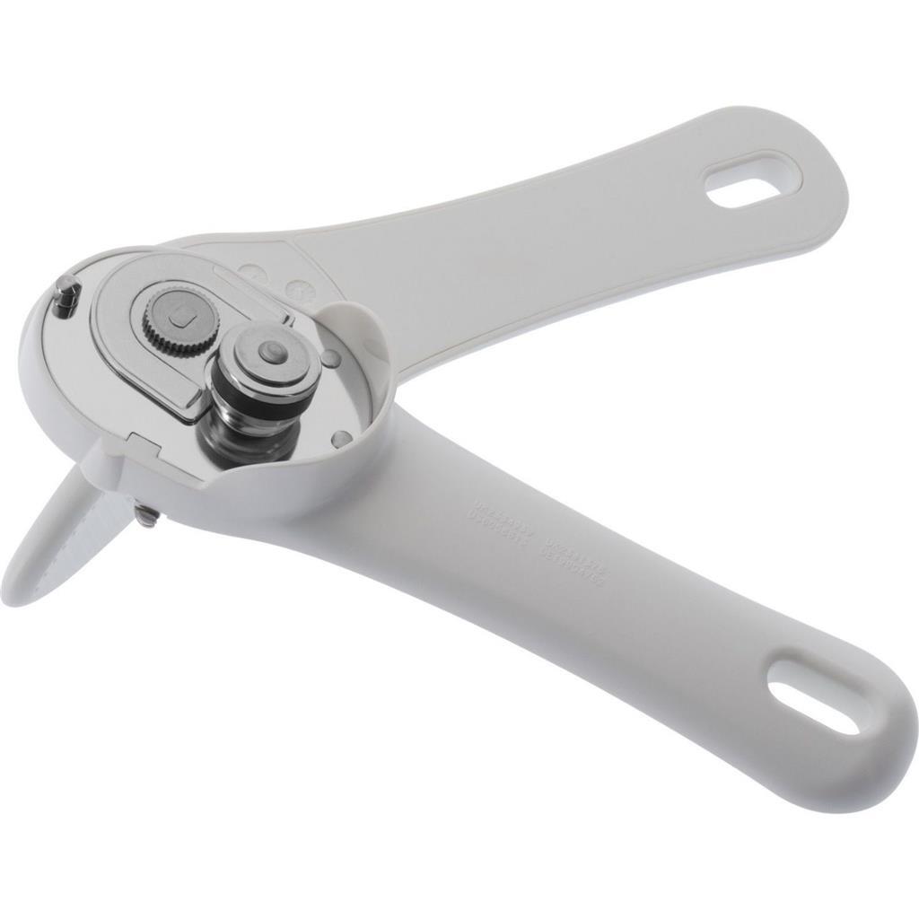 Met de betrouwbare blikopener opent u moeiteloos blikken – en zonder risico op letsel! Plaats hiervoor de opener horizontaal op de rand van het blik, druk de hendels tegen elkaar en draai aan de knop – het snijwiel beweegt langs het blik en opent het deksel zonder scherpe randen! Het deksel kan eenvoudig met de tang worden verwijderd en weer worden teruggeplaatst om het blik weer te sluiten. Kleur: wit.