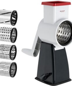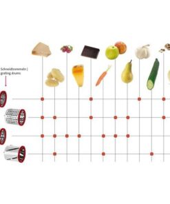 Groenterasp molen Multi. Deze groenterasp molen is voorzien van 4 roestvrij stalen snij-trommels: waarvan 3 trommels voor het grof, middel en fijn raspen en 1 trommel voor schijfjes. Raspen, snijden, schaven van fruit, groente, noten, chocola, kaas, enz. De trommels zijn gemaakt met een speciale ets-techniek, resultaat: extreem scherp en duurzaam. Met vinger bescherming. De trommels zijn heel gemakkelijk te wisselen. De sterke zuigvoet zorgt voor een veilige en stabiele stand op gladde oppervlakken.