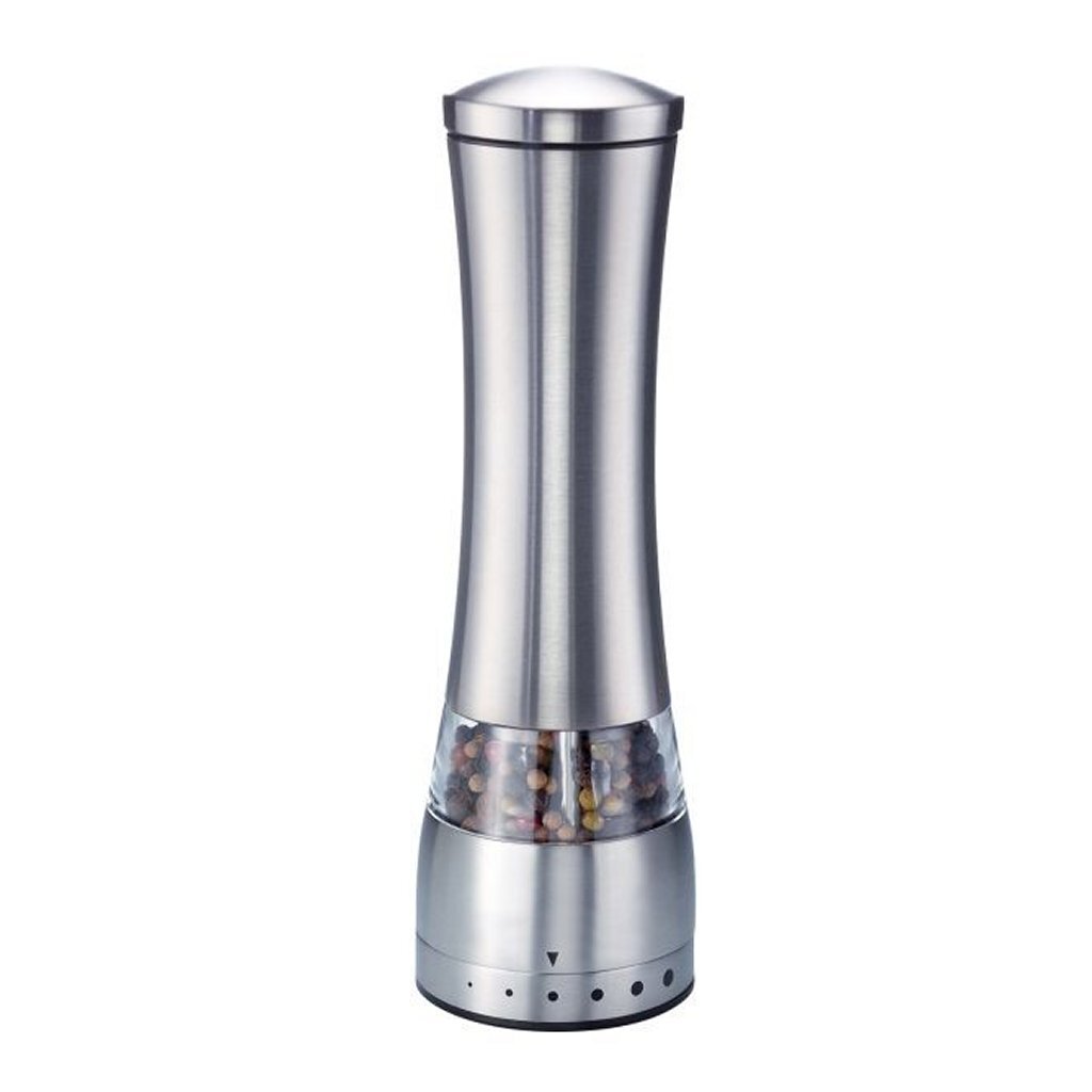Elegante peper-zout molen van Westmark met kijkvenster voor het vermalen van droge kruiden zoals peper, grof zout en fleur de sel. Individueel aanpasbare grove en fijne maalgraad dankzij stelring onderaan; moeiteloos malen dankzij robuust keramisch maalwerk. Gebruiksvriendelijk dankzij de zandlopervorm en de gemakkelijk te hanteren behuizing van roestvrij staal. Lange levensduur; eenvoudig te reinigen met de hand. Lengte: 21 cm.