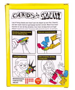 Op zoek naar een partyspel voor kleine én grote groepen waar je dochter van 6, bevriende gezinnen met pubers en je oma van in de 80 aan mee kunnen doen? Zoek dan niet verder! Voor Cards vs Gravity heb je alleen een fles en het speelmateriaal in de doos nodig. Door de waterdichte kaarten kun je de fles overal neerzetten: op een tafel, in het zand op het strand, in de kroeg of aan de rand van het zwembad. Plezier gegarandeerd! Dit grappige en vrolijke partyspel is leuk voor iedereen die gewoon iets luchtigs wil spelen. Van familiebijeenkomsten, vrijgezellenfeesten, kinderpartijtjes tot met zijn allen in de kroeg. Zet een lege fles op tafel en je kunt spelen. Iedereen kan meedoen! In Cards vs Gravity balanceer je kaarten op een fles. Een magnetische schijf houdt de boel redelijk lang in evenwicht. Elke beurt pak je een kaart en steek je die in een kaart van dezelfde kleur of hang je die eraan. Valt er niets, dan is de volgende speler aan de beurt. Vallen er wel kaarten van de fles, dan krijg je daar strafpunten voor. Wie aan het einde van het spel de minste strafpunten heeft, verslaat niet alleen de zwaartekracht, maar ook zijn medespelers!