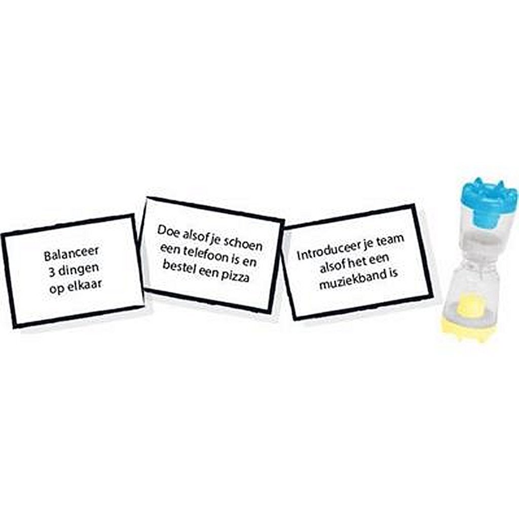 Party Spel 20 Second Showdown. Geschikt voor 5 tot 20 spelers vanaf 10 jaar. Een vliegensvlug gezelschapsspel. Eén speler is de scheidsrechter. De anderen verdelen zich over twee teams, gaan tegenover elkaar zitten en zetten zich schrap. Aan het begin van elke ronde zet de scheidsrechter de zandloper terug met een gelijkmatige hoeveelheid zand in elke helft. De scheidsrechter draait de zandloper om en leest de kaart voor. Elke kaart bevat 2 uitdagingen en de scheidsrechter bepaalt welke kant in een ronde wordt gebruikt. Sta op en doe de YMCA. Stel jezelf netjes voor zonder je mond dicht te doen. Noem drie landen die beginnen met de letter B. Gebruik je eigen sok als handpop. Noem alle dingen op die je vandaag hebt gegeten. Bij iedere behaalde uitdaging draait de scheidsrechter de zandloper om. Om te winnen, moet je het andere team dwingen om zonder zand te zitten door je uitdagingen zo snel mogelijk af te ronden. Het eerste team dat zonder zand komt te zitten, verliest de ronde en het eerste team dat drie ronden wint, wordt gekroond tot kampioen!