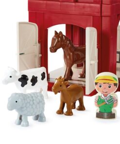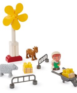 Grote ecologische boerderij met zonnepanelen en een windmolen om elektriciteit te produceren en een waterreservoir. Deze boerderij bevat ook een boerenechtpaar, een tractor met aanhanger, een graansilo en tal van accessoires. Geschikt voor kinderen vanaf 18 maanden.