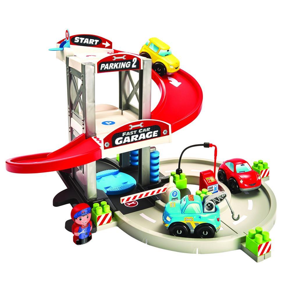 Abrick garage met 3 voertuigen en een figuurtje. Geschikt voor kinderen vanaf 18 maanden.
