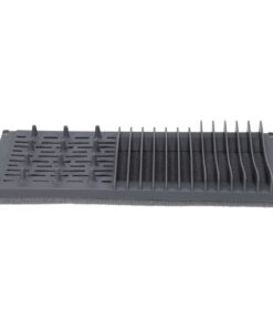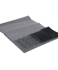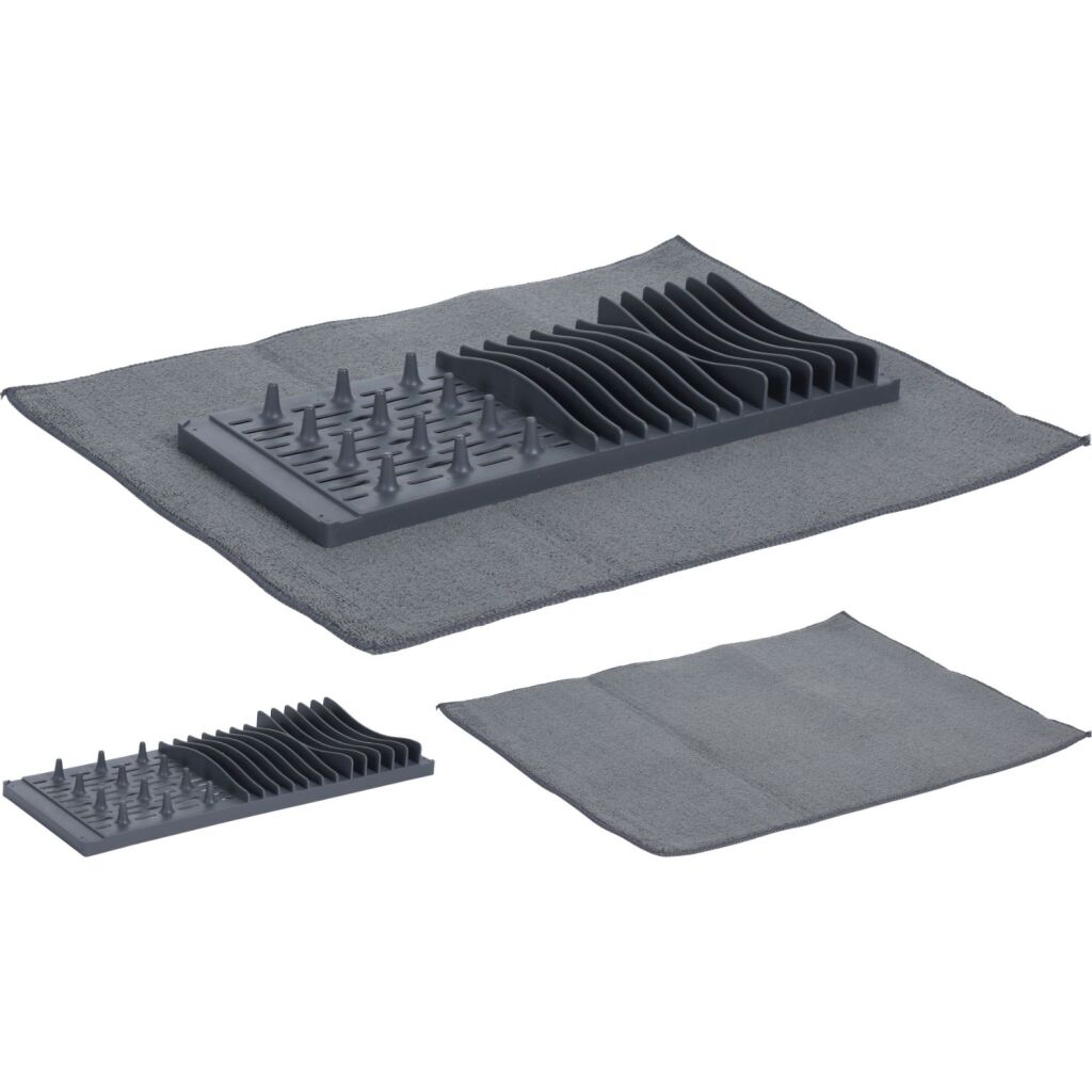 Een afdruiprek op een mat die het water absorbeerd. Het formaat is 38×48 cm, en door het flexibele materiaal is het afdruiprek makkelijk op te bergen of mee te nemen. Kleur: antraciet.