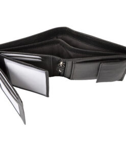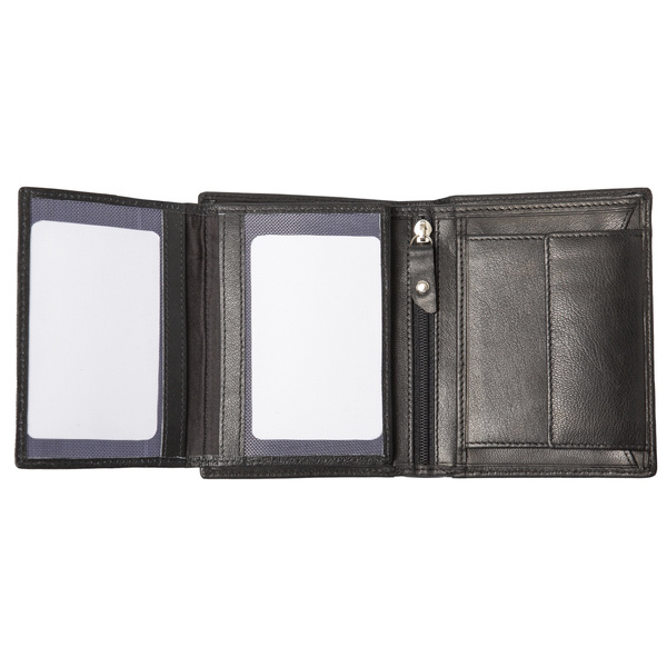 Lederen porteuille, staand formaat, zeven creditcardvakken, twee vakken, drie doorzichtige vakken, ritsvak, twee papiergeld vakken, muntvak.