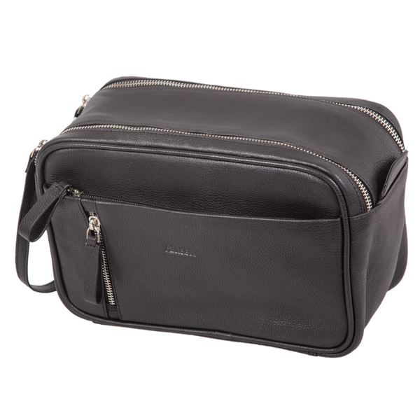 Hoofdcompartiment met magnetische sluiting, twee compartimenten vooraan met rits, compartiment met rits op de achterzijde, binnenin: drie opbergvakken. Materiaal leer, afmetingen ca. 16 x 24,5 x 12 cm.