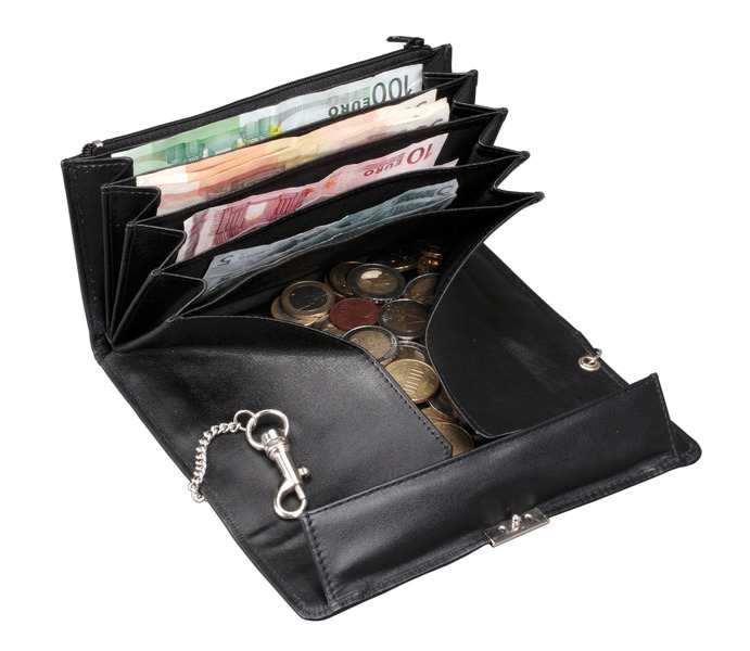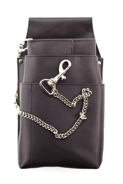 Alassio kelnerportefeuille met kerring. Zes opbergvakken voor biljetten, portemonnee, compartiment met ritssluiting, compartiment aan de achterzijde met instelbare sluiting met 3 posities, met metalen ketting.Afmeting 18,5 x 9,5 cm. Materiaal nappa leer.