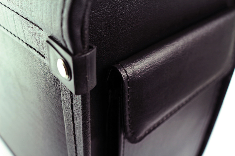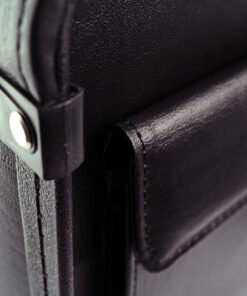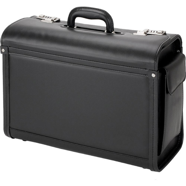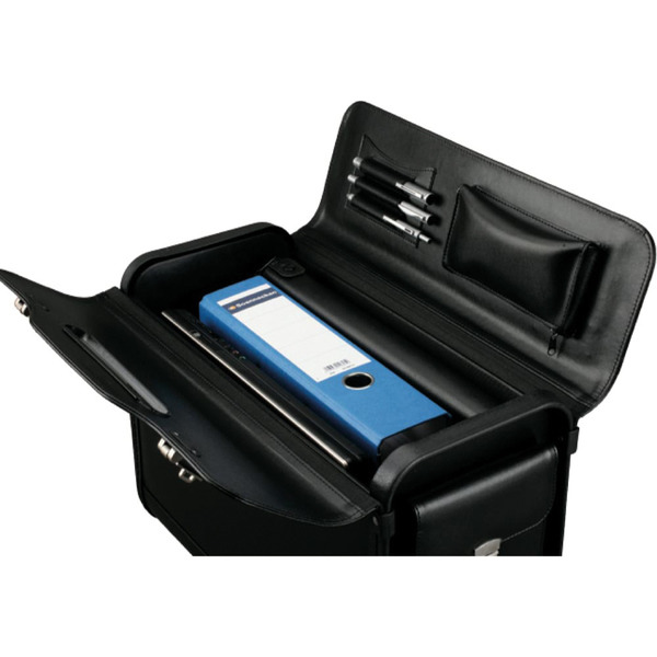 Alassio pilotenkoffer met groot hoofdvak, twee combinatie sloten, compartiment met ritssluiting en drie pennenhouders in het deksel, een zijvak. Formaat 35x46x20,5 cm. Materiaal imitatieleer. Kleur zwart.