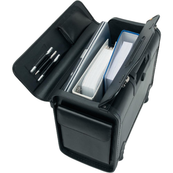 Alassio pilotenkoffer met trolleysysteem, twee combinatie sloten en ƩƩn zijvak. Binnenafwerking: groot hoofdvak, laptop compartiment en drie pennenhouders. Compartiment met ritssluiting in het deksel. Afmeting 40×48,5×24 cm. Imitatieleer, zwart.