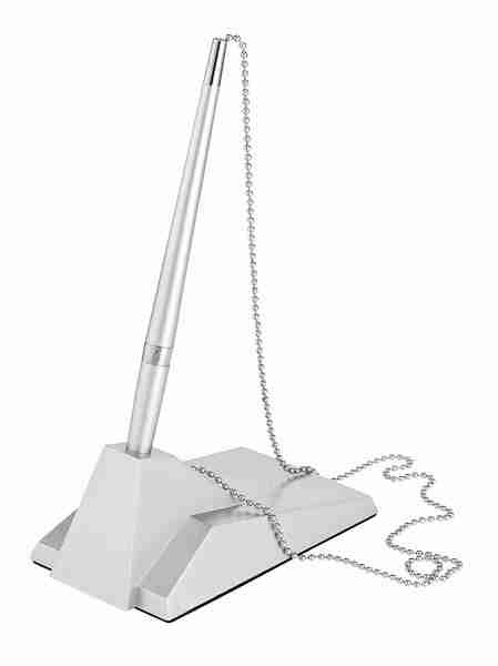 Fraaie zwarte balpen, bevestigd aan een rechthoekige kunststof standaard dmv een verchroomde metalen ketting. De ketting is 55cm lang. De maat van de standaard is 19,5x7x11,5cm. De pen heeft een standaard hervulbare vulling. Zelfklevend om glijden te voorkomen. Kleur zilver..