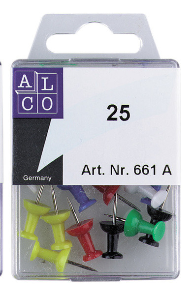 Pushpin met kunststof kop en stalen punt. Voor gebruik op o.a. bulletin- en textielprikborden. Stiftlengte 10 mm. Leverbaar in meerdere kleuren en assorti. Verpakt in een hardplastic doosje à 25 stuks. Assorti