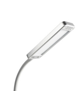 Elegant en compacte LED bureaulamp in een simpele moderne look. De lamp en de voet hebben dezelfde vorm. Het bovenste deel van de lichtarm is flexibel, en in alle richtingen verstelbaar. De lamp is in 3 stappen dimbaar en ook in 3 verschillende lichtkleuren configureerbaar. (warme en koude verlichting). 230V/ 16+8LEDs / 6W. Lichtstroom: 360 lumen. Lichtsterkte: op 30cm 1200 lux. Levensduur van de LED’s ca. 30.000 uur. Kleurtemperaturen: 3000-4000-6000k Kleur lamp: Zilver.