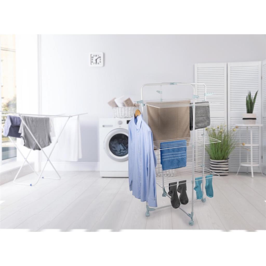 - 143 centimeter hoog, en 68 centimeter breed. De 30 meter ophangruimte is verdeeld over 6 onafhankelijke plateau’s op 3 verdiepingen. Daarnaast heeft het rek 4 haken waar je per stuk 4 kledinghangers kwijt kunt!