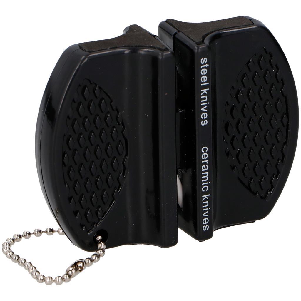Een draagbare messenslijper gemaakt van roestvrij staal en keramiek met twee gekruiste hardmetalen messen met vooraf ingestelde hoeken om elke keer de perfecte rand te garanderen. De tweede stap maakt gebruik van gekruiste keramische staven om een ??vlijmscherpe rand te creƫren. Kan gebruikt worden voor messen, scharen, gereedschappen en meer kleine voorwerpen.Materiaal keramiek, staal, kunststof.Afmeting 7 x 6 cm.