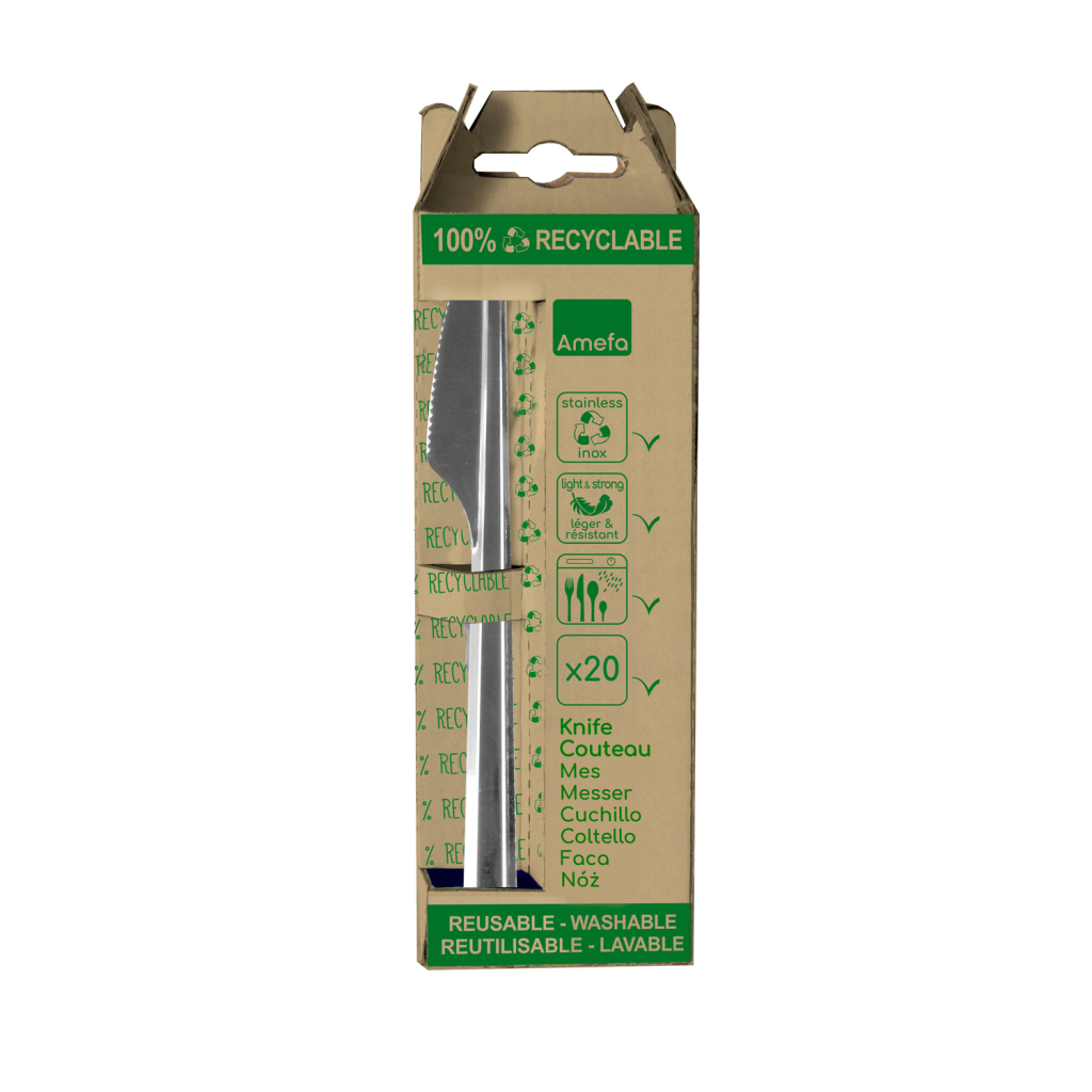 De 20-delige set tafelmessen van Amefa in de serie Leaves is een duurzaam alternatief voor plastic en ander wegwerpbestek. Proactief ontworpen door Amefa, anticiperend op de Europese wetgeving om single use plastics uit onze samenleving te verbannen. Leaves is licht en dun maar voelt, eet en ziet eruit als gewoon bestek. Het ontwerp heeft een gebogen, glanzende handgreep die is geoptimaliseerd om het te kunnen stapelen. Omdat het bestek is gemaakt van roestvrijstaal, is het volledig recyclebaar, vaatwasmachinebestendig en geschikt voor veelvoudig gebruik.