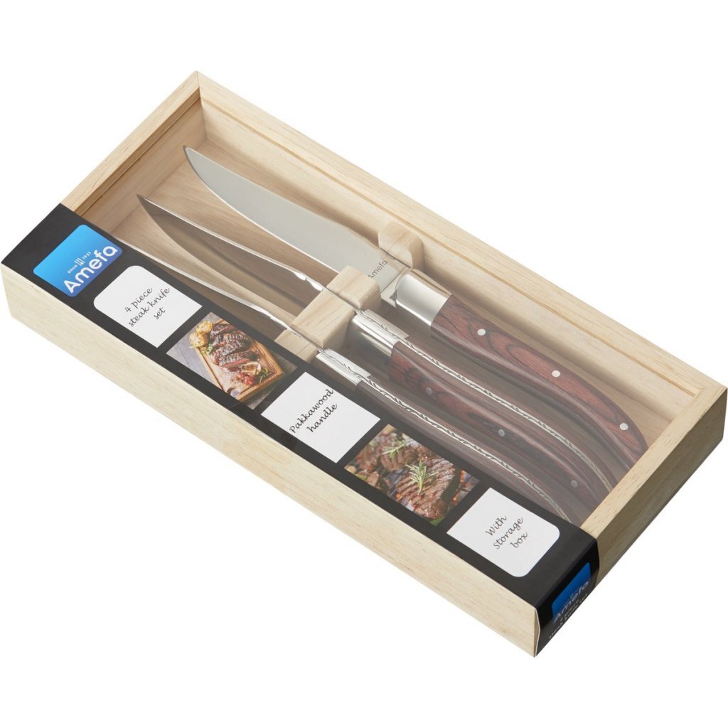 De Amefa Royal Steak steakmessen zijn perfect voor zowel een informele barbecue als een luxe diner. Ze hebben een handvat gemaakt van hoogwaardig Pakka Wood en het lemmet is vervaardigd uit gehard messenstaal van topkwaliteit. Bovendien zijn ze uitgerust met een stalen bolster voor extra stevigheid. Dankzij de fijne kartels snijd je moeiteloos door elk stuk vlees, ongeacht de grootte.