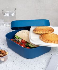 Lunchset bestaande uit brooddoos met tussenschot en sauspotje. Te gebruiken in klein, medium of groot. Geschikt voor magnetron, vriezer en vaatwasser. Met elastiek om alles bij elkaar te houden. Kleur: navy blauw.