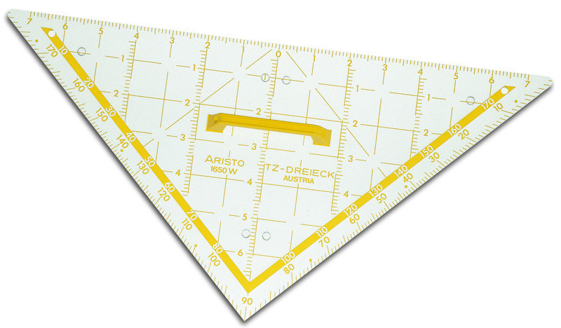 Tekendriehoek voor schoolbord 80cm. De driehoek ziet er hetzelfde uit als de normale driehoeken 1650 die leerlingen bij zich hebben. Voorzien van handgreep. Transparant kunststof.