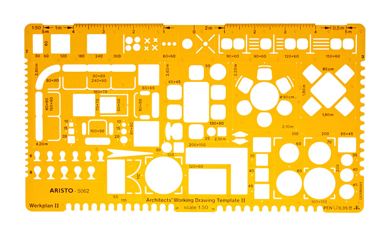 Architectsjablonen. Schaalverdeling 1:50. met symbolen voor het ontwerp van woonkamers, slaapkamers, eetkamers en keukens.