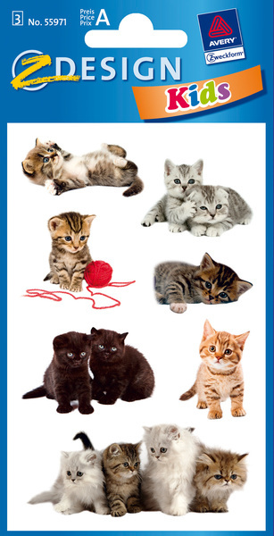 Kleurrijke papieren stickers, deels met glitters of reliëf. Formaat vel 76x120mm. Aantal vel 3. Motief katten foto.
