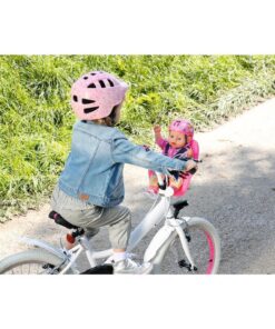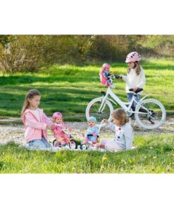 BabyBorn oefent op haar fiets met zijwieltjes, maar haar benen zijn nog niet sterk genoeg voor een langere fietstocht. In een dergelijk geval vindt de kleine globetrotter het heerlijk om in haar fietsstoeltje te zitten terwijl één van de grotere kinderen fietst. Het comfortabele en ergonomische fietsstoeltje is voorzien van geometrische patronen. Dankzij het riempjessysteem blijft Baby Born altijd veilig in haar zitje zitten, zelfs als de rit over hobbelig terrein gaat. Je kunt het stoeltje heel eenvoudig aan het stuur van een kinderfiets bevestigen met behulp van het klittenbandsysteem. En daar gaan we…