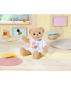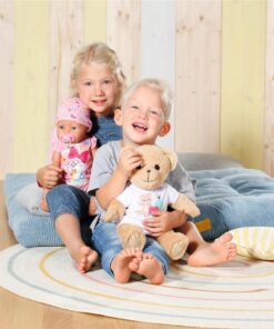 Deze beer van 36 cm kan alles zijn: meisje, jongen, baby, knuffelbeer, speelkameraadje, trooster, prinses of brandweerman – vanaf de allereerste dagen tot de kindertijd een verre herinnering is geworden. De kleine beer met de lieve glimlach heeft een zacht, pluchen lichaam. De eerste outfit is een roze romper. De beer heeft een eigen modecollectie en berenaccessoires, maar kan ook bijna alle kleding van Baby born dragen en haar accessoires gebruiken. Het lichaam is zo ontworpen dat bijna alle kleding voor de Baby born-pop van 43 cm de beer past. Alleen de schoenen passen niet. Maar welke beer heeft er nou schoenen nodig? Doordat de armen en benen flexibel zijn en het hoofd kan draaien, kun je de beer makkelijk aan- en uitkleden. De beweeglijkheid maakt de beer ook perfect voor allerlei spellen en rollenspellen. Wie mag er als eerste iets in het vriendenalbum met het extra stickervel schrijven?