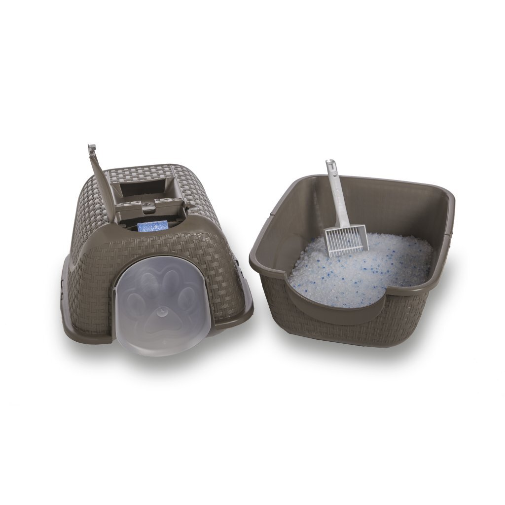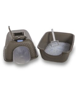 - De kattenbak heeft een schep die, eenmaal geplaatst, tevens als handgreep fungeert