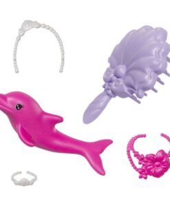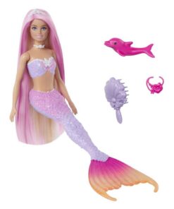 Deze Barbie zeemeermin transformeert speelplezier in pure magie doordat ze in water van kleur verandert! Alsof de zeemeermin betoverd is door onderzeese krachten, veranderen het superlange haar, het voorgevormde lijfje en de staart met kleurverloop van suikerspinroze in levendig paars en weer terug. Barbie ‘Malibu’ heeft stylingaccessoires, een borstel en een schattig huisdier, waardoor ze een fantastisch cadeau is voor kinderen van 3 jaar en ouder! Pop kan niet zwemmen of los staan. Kleuren en versieringen kunnen varieren.