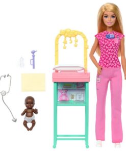 Deze set bevat de werkomgeving van een babydokter inclusief Barbie en haar schattige babypop patiënt! Barbie draagt haar roze dokterskleding met hartjesprint, klaar om baby’s gelukkig en gezond te houden! De set bevat ook de onderzoekstafel van Barbie, met sterren erboven en een plank eronder voor alle accessoires, zoals een babyflesje of Barbies stethoscoop. Met deze krachtige pop kan de verbeeldingskracht zijn werk doen met een wereld van verhaal- en carrièremogelijkheden, klaar om kinderen te inspireren tot wie ze maar willen zijn! Pop kan niet los staan. Kleuren en versieringen kunnen variëren. Geschikt voor kinderen vanaf 3 jaar.