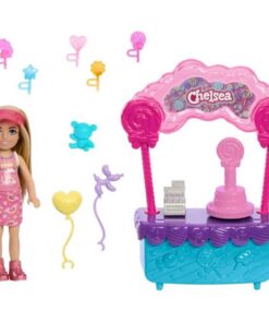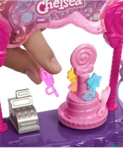 De toonbank van de snoepwinkel heeft een kassa en een draaiende display met lolly’s. Accessoires te koop bij het lolly- en snoepstalletje inclusief een schattige teddybeer, 5 lollytraktaties en 2 leuke ballonnen die echt passen in de poppenhandjes. Deze Chelsea pop is klaar om het snoepstalletje te beheren in haar roze zonneklep en schortje. Kinderen kunnen dit favoriete moment uit de animatiefilm Barbie and Stacie to the Rescue naspelen! Pop kan niet los staan. Afwijkende kleuren en versieringen mogelijk. Geschikt voor kinderen vanaf 3 jaar.