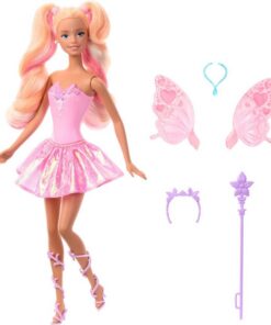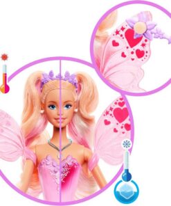 Doop haar stervormige toverstafspons in koud water en veeg vervolgens over haar vleugels om de hartjes te veranderen van mooi roze naar schitterend rood! ´Zwaai´ met de toverstaf over haar lijfje voor een betoverende ombre onthulling. Verander terug met warm water voor herhaaldelijk kleurplezier. Deze Barbie feeëndop glinstert in haar jurk, wijnrankhakken, vlinderhoofdband en waterdruppelketting – en laat overal een beetje sprankeling achter waar de verbeelding naartoe gaat! Kleuren en decoraties kunnen variëren. Geschikt voor kinderen vanaf 3 jaar.