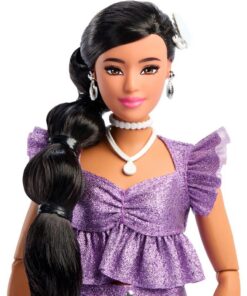 Deze Barbie pop schittert als een juweel in haar amethist-kleurige outfit! Haar schitterende combinatie bestaat uit een topje met ruches en getailleerde shorts. Ze is mollig en draagt haar zwarte haar in een bubbelvlecht. Een witte baret, oorbellen en diverse halskettingen maken haar look af! Als accessoires heeft ze een tasje, bezet met kralen, en zilverkleurige hakken met bandjes. Met haar beweegbare gewrichten kun je haar in allerlei poses zetten! Geschikt voor kinderen vanaf 4 jaar.