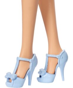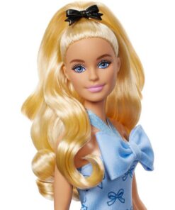 Barbie draagt haar lange blonde haar in een vrolijk springende paardenstaart! Als accessoire draagt ze een zwarte strik in het haar die haar zachte persoonlijkheid accentueert.Haar babyblauwe halterjurkje heeft niet alleen een strik bij de halslijn, maar is ook bezaaid met prints van strikken!De bijpassende blauwe hoge hakken zetten de puntjes op de i. Geschikt voor kinderen vanaf 3 jaar.