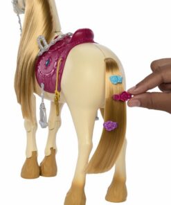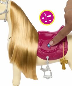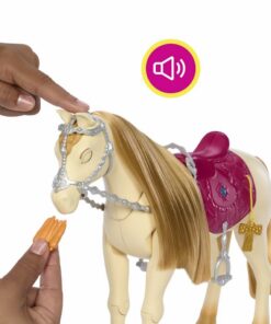 Dit interactieve speelgoedpaard maakt meer dan 20 geluiden en je kunt er op minstens evenveel manieren mee spelen, van verzorgen tot optreden en staart en manen stylen. Dit Barbie paard danst, knippert met zijn ogen, speelt liedjes af die door de serie zijn geïnspireerd, en maakt leuke geluiden, zoals hinniken, knabbelen, galopperen en meer. Accessoires zoals een kampioensbeker, lekkere hapjes, een borstel en een voederbak, en natuurlijk Barbie en haar nieuwe vriendje Tornado prikkelen de fantasie van kinderen! Afwijkende kleuren en versieringen mogelijk.