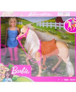 Barbie heeft een heel mooi paard. Het paard is beige, met blonde manen. Leg het zadel op de rug van het paard en doe het hoofdstel om. Barbie heeft haar rij-outfit al aan! Ze heeft een schattig blauw topje met polka-dots aan, een roze rijbroek en stoere laarzen. Ze hoeft alleen nog maar haar bijpassende roze cap op te zetten en ze kan opstijgen! Ga voor een rustige rit door het bos of galoppeer langs het strand. Jouw fantasie is de limiet! Welke verhalen ga jij beleven?